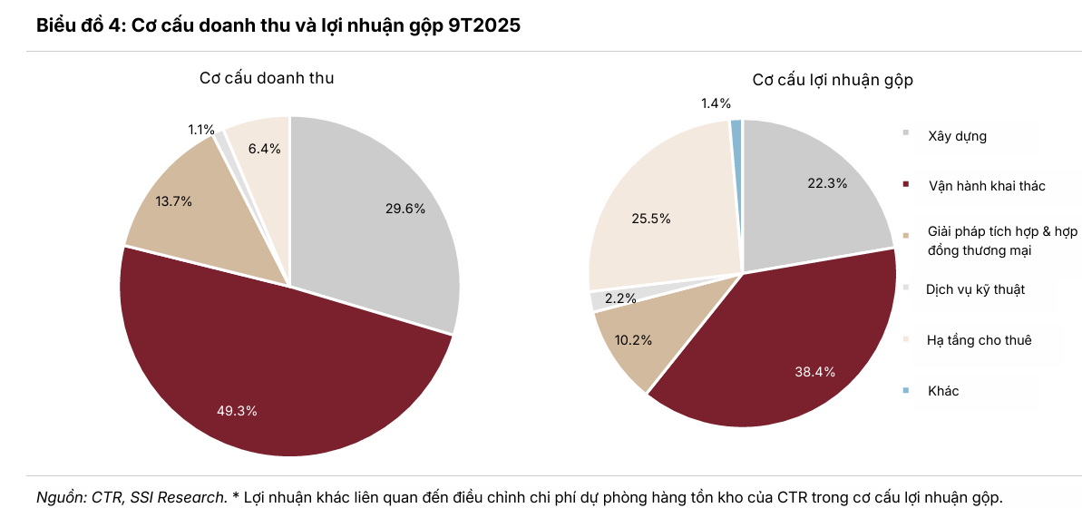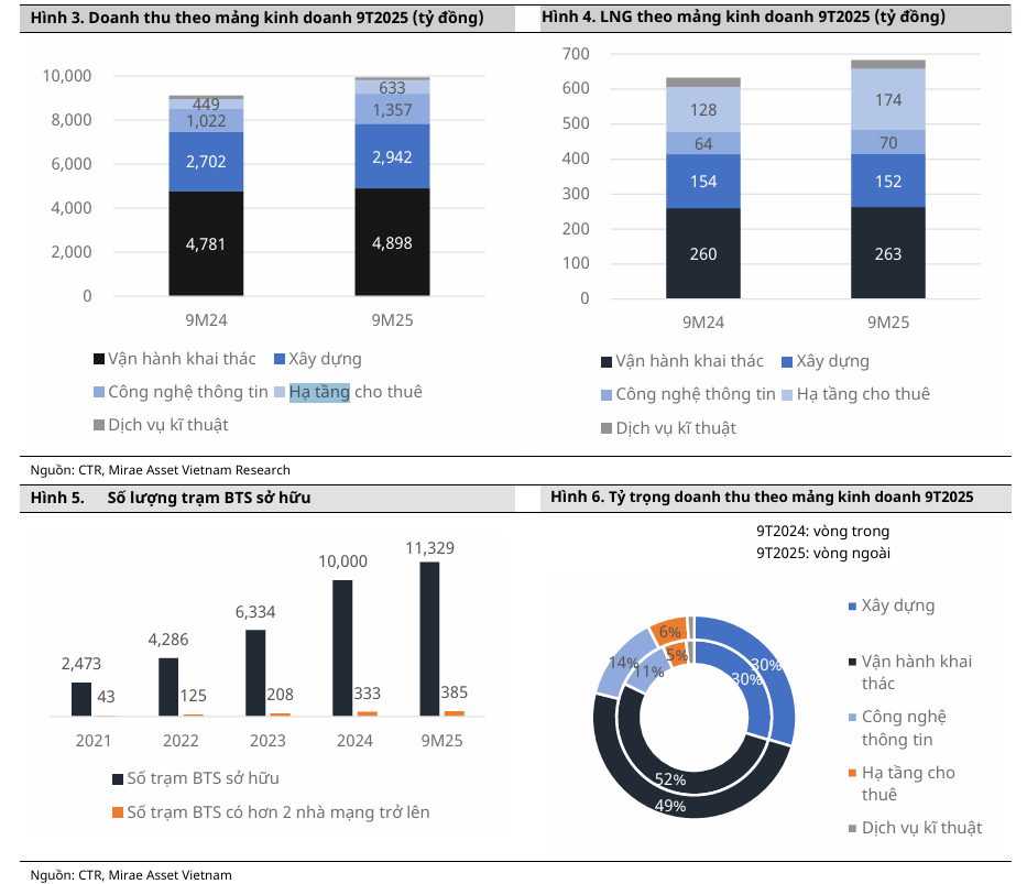 Trong cơ cấu doanh thu, mảng Hạ tầng cho thuê (TowerCo) tiếp tục khẳng định vai trò là động lực tăng trưởng mạnh nhất, ghi nhận mức tăng doanh thu 9 tháng đầu năm là 41% so với cùng kỳ. Tính đến cuối quý 3/2025, CTR sở hữu và quản lý tổng cộng 11,329 trạm thu phát sóng (BTS), tăng 29% so với cùng kỳ năm trước. Biên lợi nhuận gộp mảng Towerco đến quý 3 là 28.8% và 9 tháng đầu năm là 27.6%, giảm nhẹ 1 điểm % so với năm ngoái
