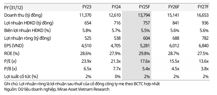 Nhìn về năm 2026, MAS dự phóng doanh thu của CTR đạt 15,141 tỷ đồng (+10% CK) và lợi nhuận sau thuế tăng 14% yoy, lên 688 tỷ đồng. Các giả định chính bao gồm: