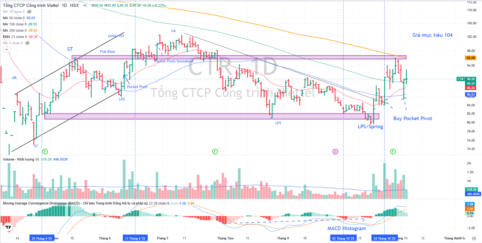 Cấu trúc tích lũy của CTR cho thấy cổ phiếu này đang ở pha D và sau khi rung lắc tại MA200 ngày, nhưng nhận được hỗ trợ ở MA50 ngày, cổ phiếu có khả năng tiếp tục tăng giá. Hiện tại vẫn có thể mua được ở vung giá quanh 90,000 đồng.