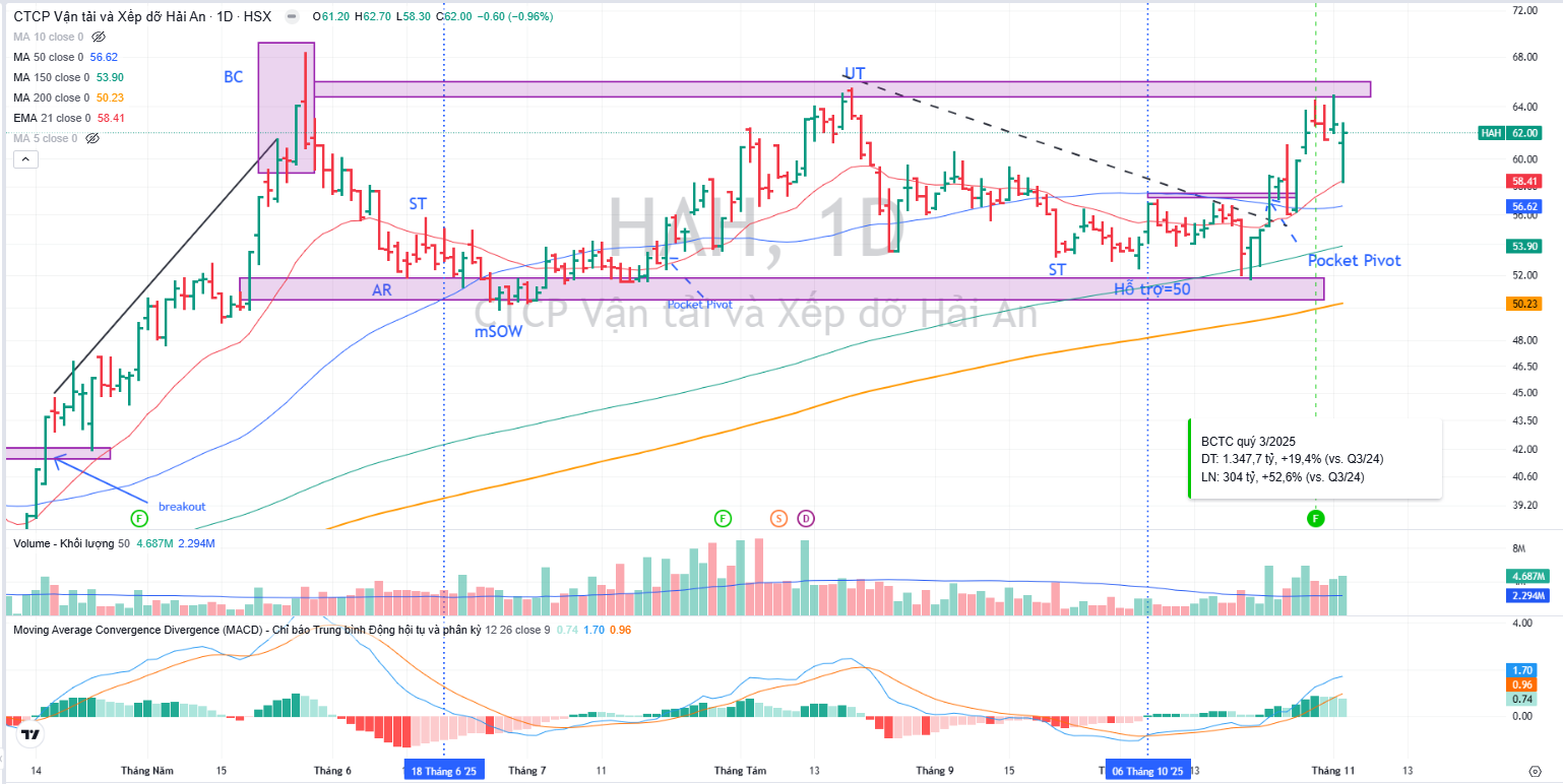 Trên đồ thị, HAH có RS=95, hoạt động tốt vượt trội trên thị trường. Ngày 27.10.2025, Elibook Team khuyến nghị mua HAH ở vùng giá 58,000-60,000 theo điểm mua Pocket Pivot. Cổ phiếu hiện nay đang kiểm tra lại đỉnh tháng 5 và tháng 8. Đây là lần thứ ba và khả năng có thể breakout thành công nếu thị trường chung thuận lợi.