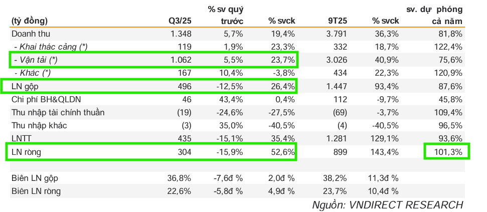 Theo quan điểm VNDirect, mặc dù tổng sản lượng container quý 3 đạt 385,910 TEUs, giảm nhẹ 0.6% so với quý trước, nhưng doanh thu vẫn duy trì tăng trưởng, tăng 5.7% qoq và 19.4% yoy, đạt 1,300 tỷ đồng, là nhờ việc sản lượng container trên các tuyến quốc tế cải thiện, đồng pha với xu hướng “front-loading” (tăng tốc giao hàng) trên các tuyến ngắn, từ đó giúp giá bán trung bình (ASP) được cải thiện nhẹ so với mức nền cao của quý 2/2025.