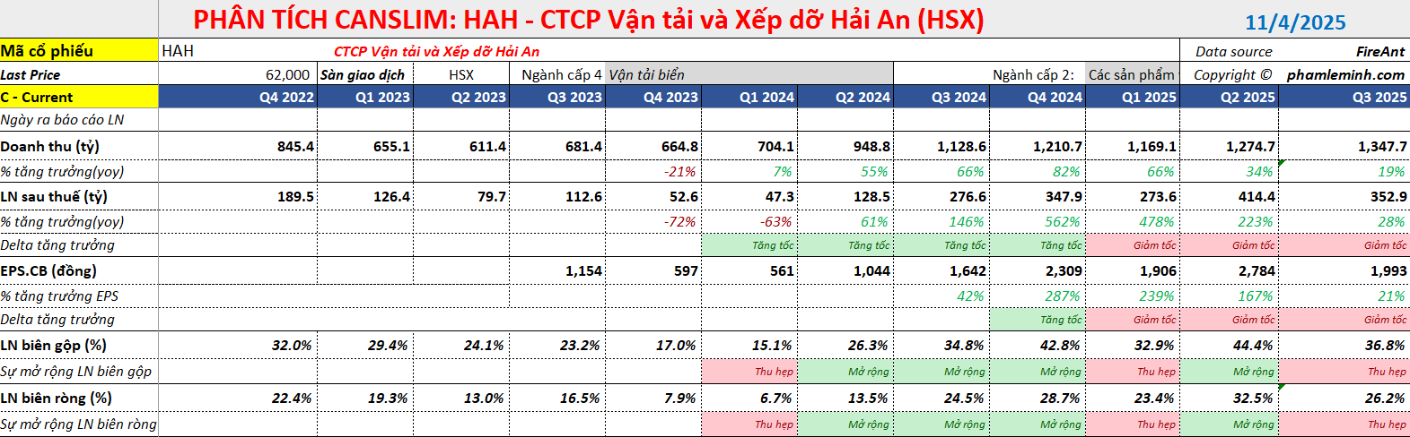 Doanh thu thuần Quý 3/2025 tăng 19% yoy chủ yếu nhờ công suất tăng lên khi HAH đưa vào khai thác các tàu mới. Ngoài ra, giá cho thuê tàu tăng đối với các tàu được gia hạn hợp đồng cũng đóng góp vào tăng trưởng doanh thu. HSC cũng lưu ý thêm việc HAH tiếp nhận tàu Hai An Iris (1,100 TEU) vào ngày 17/10/2025, nâng tổng đội tàu lên 18 chiếc với tổng sức chở 29,300 TEU. Tàu này đã được đưa vào hoạt động trên tuyến Hải Phòng – Liên Vân Cảng (Trung Quốc) từ cuối tháng 10, hợp tác với ONE (Ocean Network Express).