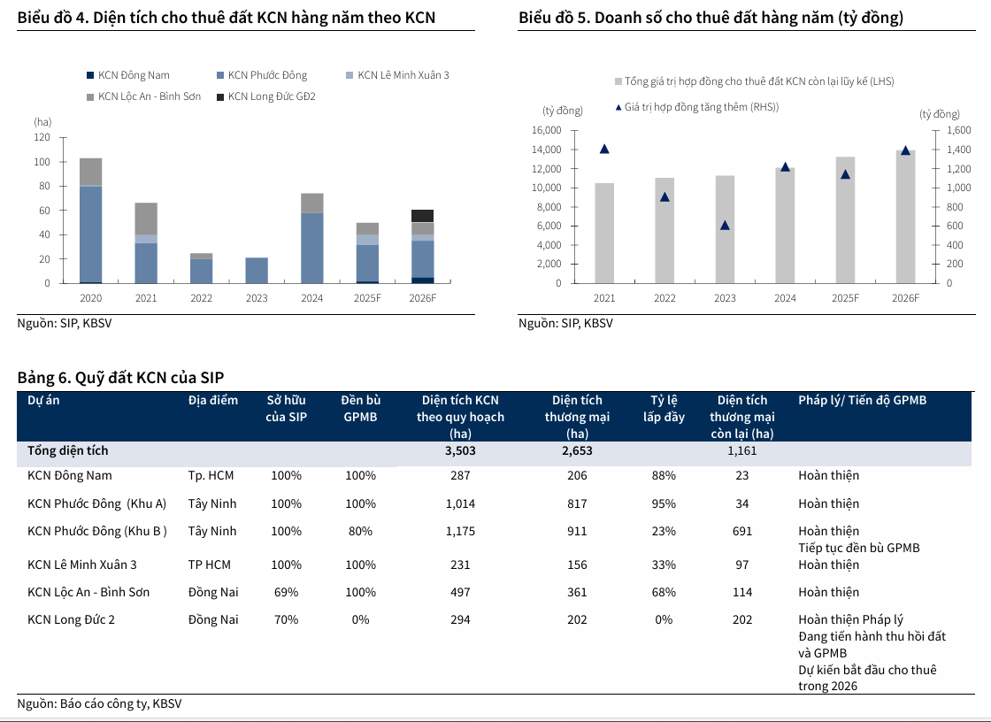 KBSV đánh giá cao SIP nhờ lợi thế quỹ đất KCN rộng lớn (1,189 ha đã hoàn thiện pháp lý) và dòng tiền ổn định từ hoạt động cung cấp điện và nước cho KCN, ước tính sản lượng điện năm 2025/2026 đạt 3,536/3,713 triệu kWh (+4%/+5% YoY).