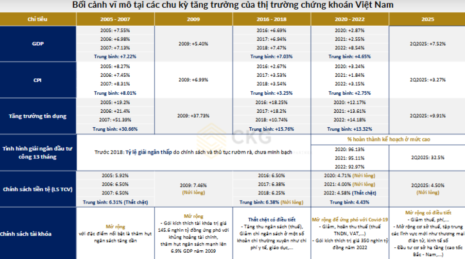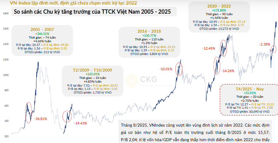 So sánh các chu kỳ tăng trưởng của thị trường chứng khoán Việt Nam trong 20 năm qua cho thấy, chu kỳ 2025 đang ở giai đoạn giữa của pha mở rộng, với đặc điểm ổn định hơn và mức định giá hợp lý hơn so với các giai đoạn trước: