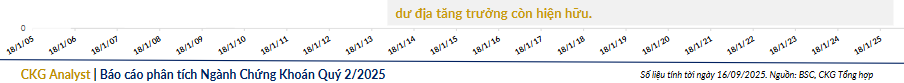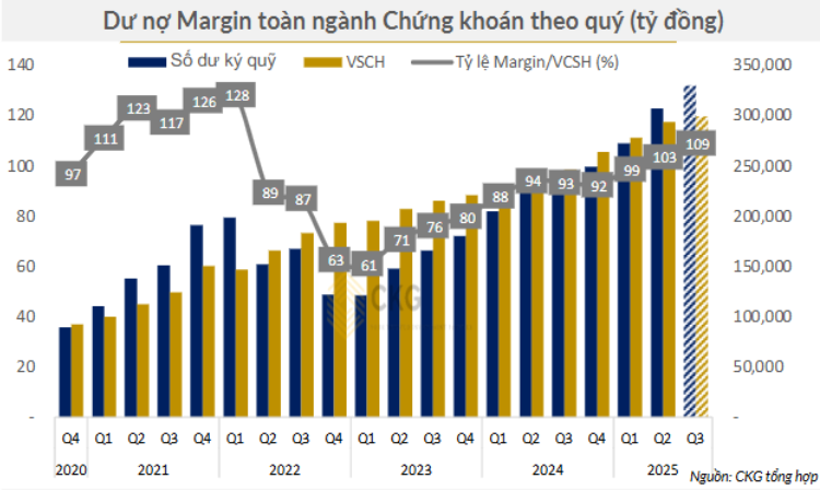 Dư nợ margin toàn ngành đạt 304 nghìn tỷ đồng (+7% QoQ), tương đương 103% vốn chủ sở hữu, mức cao nhất kể từ quý II/2022 nhưng vẫn an toàn so với trần 200%. CKG ước tính dư địa cho vay còn khoảng 234 nghìn tỷ đồng, tạo không gian mở rộng tín dụng trong nửa cuối năm.