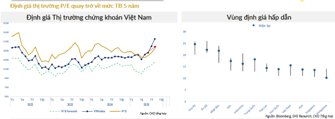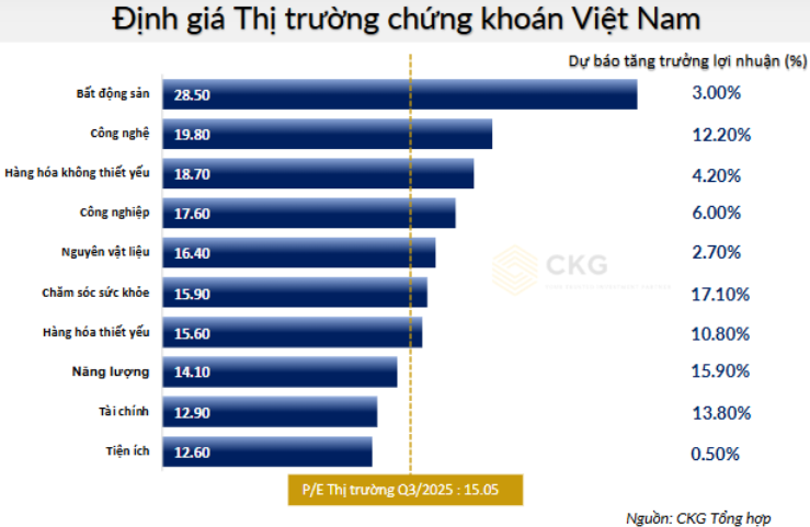 Đến cuối quý III/2025, P/E bình quân của VN-Index đạt 15.05 lần, phản ánh mức định giá trung bình 5 năm. Tuy nhiên, sự khác biệt giữa các nhóm ngành là rất lớn: