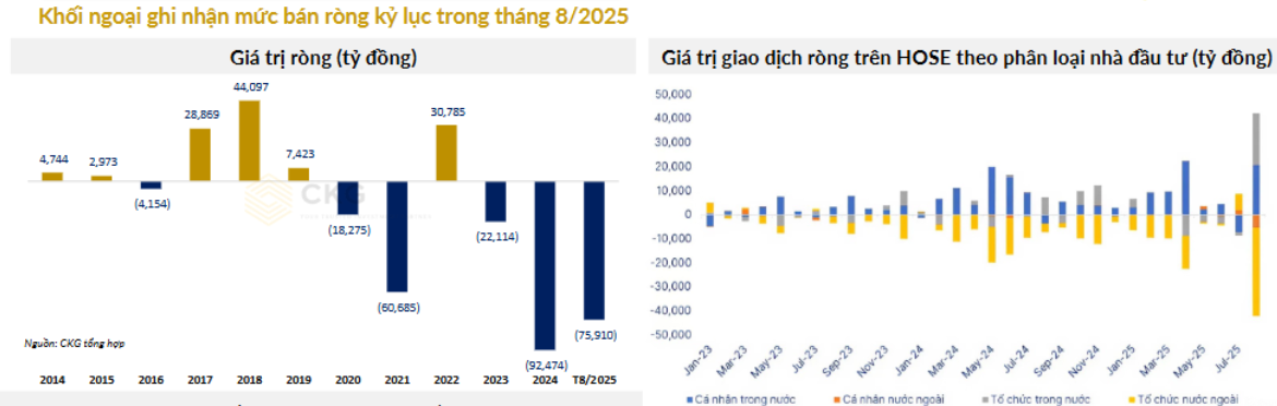 Trong tháng 8/2025, khối ngoại bán ròng kỷ lục 36,789 tỷ đồng, mức cao nhất trong nhiều năm, đưa tổng giá trị bán ròng 8 tháng đầu năm lên 75,910 tỷ đồng, tương đương 80% cả năm 2024. Nguyên nhân chính đến từ áp lực tỷ giá khi USD/VND tăng 3.5% kể từ đầu năm, buộc Ngân hàng Nhà nước phải can thiệp bằng bán USD kỳ hạn 180 ngày với tỷ giá 26,550 đồng. Bên cạnh đó, việc nhóm cổ phiếu vốn hóa lớn tăng mạnh trong nửa đầu năm đã thúc đẩy hoạt động chốt lời của nhà đầu tư nước ngoài, trong khi một phần dòng vốn ngoại được chuyển hướng sang các thị trường khu vực có mức tăng ít hơn.