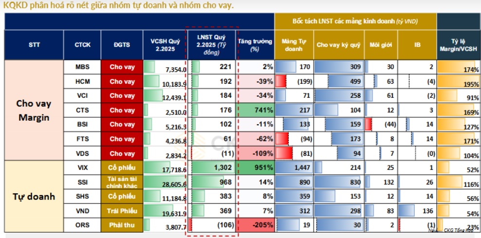 Bức tranh kết quả kinh doanh quý II/2025 của ngành chứng khoán cho thấy sự phân hóa sâu sắc giữa hai mô hình cốt lõi: tự doanh và cho vay ký quỹ.