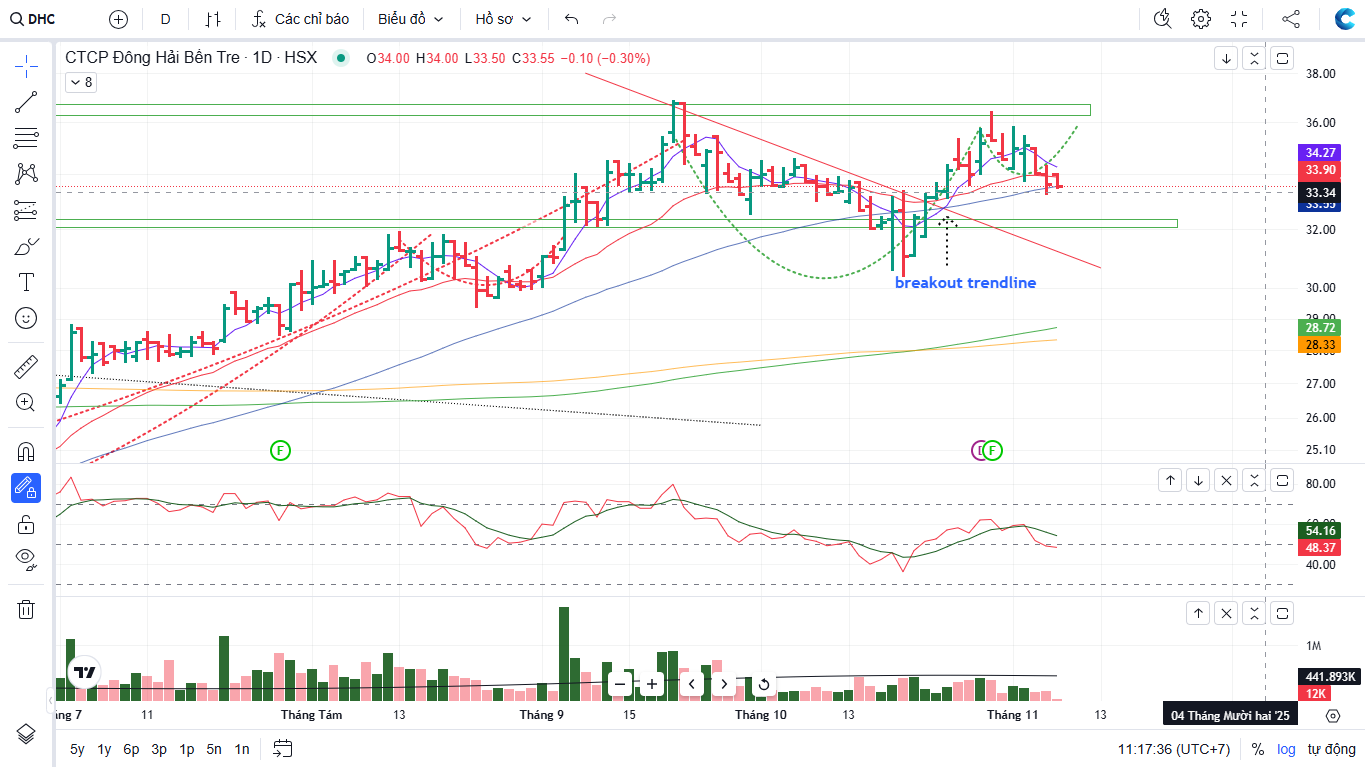 Trên biểu đồ kỹ thuật, DHC có RS=89, mức hoạt động khá tốt trên thị trường. Sau khi breakout không thành công (lần thứ 2 vượt đỉnh failed), DHC đang pullback tìm hỗ trợ về Ma50 ngày, tương ứng với điểm mua breakout trendline ngày 24/10, kỳ vọng sẽ xây được tay cầm quanh vùng giá hiện tại.