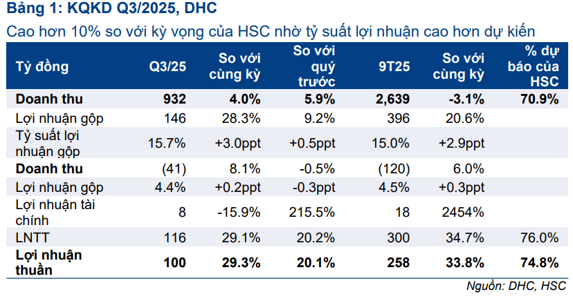 Quý 3/2025, DHC công bố kết quả kinh doanh tích cực với doanh thu thuần đạt 932 tỷ đồng, tăng 4% so với cùng kỳ và 6% so với quý trước, trong khi lợi nhuận thuần đạt 100 tỷ đồng, tăng 29% so với cùng kỳ, mức cao nhất trong ba năm gần đây và vượt 10% so với dự báo của HSC.