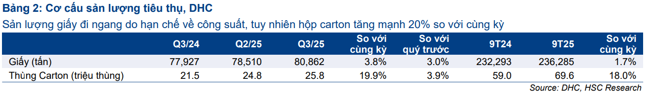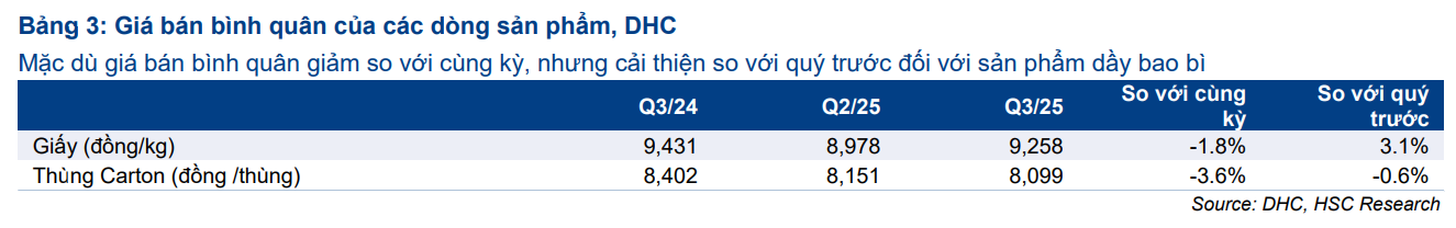 Trong quý 3/2025, DHC bán ra 80,862 tấn giấy bao bì, tăng 3.8% so với cùng kỳ và 3% so với quý trước, với giá bán bình quân 9,258 đồng/kg, giảm nhẹ 1.8% so với cùng kỳ nhưng tăng 3.1% so với quý trước.