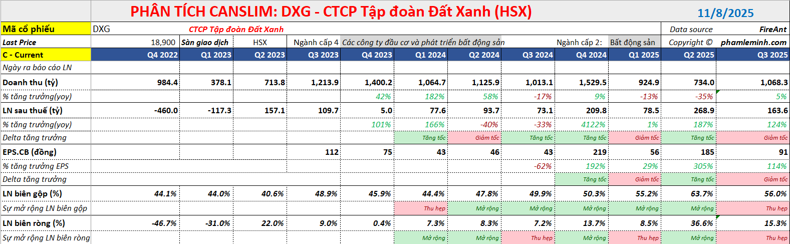 Trong quý 3/2025, DXG ghi nhận doanh thu đạt 1,068 tỷ đồng (+5% YoY) trong khi LNST cổ đông công ty mẹ đạt 93 tỷ đồng (+202% yOy), phản ánh đà hồi phục rõ nét của mảng môi giới bất động sản, lĩnh vực từng chịu ảnh hưởng nặng nề trong hai năm 2023–2024.
