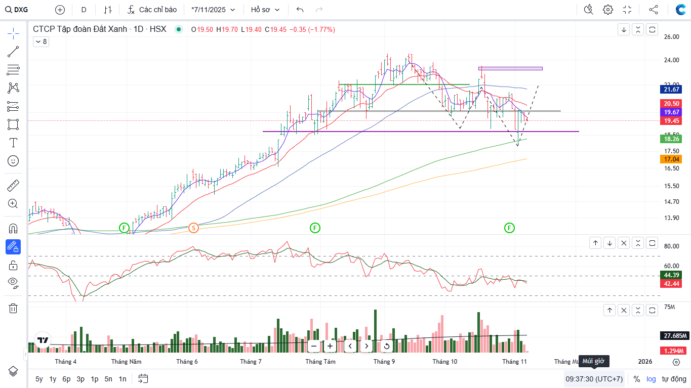 Trên biểu đồ kỹ thuật, DXG có RS=69.3, mức hoạt động khá ổn trên thị trường. DXG đang nỗ lực cân lại quanh vùng hỗ trợ 21,200 đồng. DXG đang hình thành mẫu hình Hai Đáy (W), với điểm mua pivot truyền thống 23,500 đồng, tuy nhiên cần thời gian để kiểm định lại nguồn cung sau các nhịp giảm mạnh vừa qua. Thanh khoản thấp, dao động với biên độ hẹp là dấu hiệu cổ phiếu cạn cung.