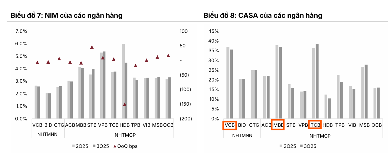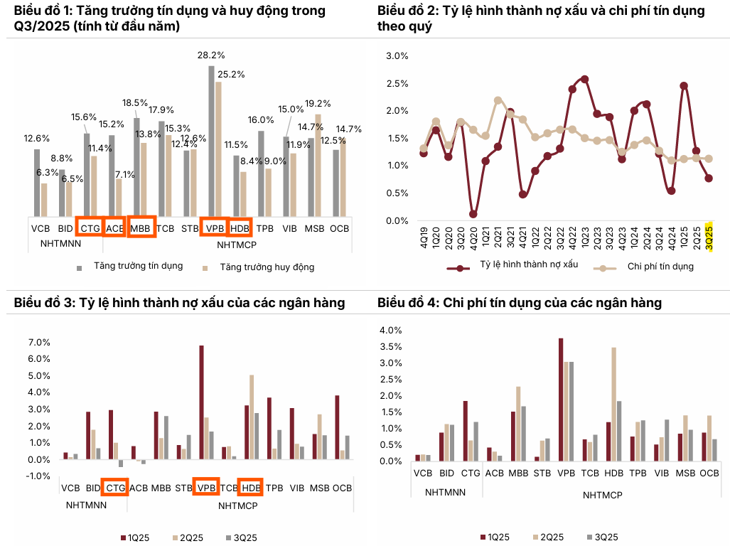 Trong khi đó, dữ liệu của SSI Research cho biết, tổng số dư nợ xấu (NPL) trong Quý 3/2025 tăng nhẹ +1.5% qoq, cho thấy chất lượng tài sản nhìn chung đã ổn định. Mặc dù vậy, diễn biến vẫn phân hóa rõ rệt: ACB, VIB, VPB, CTG và BID ghi nhận sự cải thiện, trong khi STB, OCB, MBB và HDB ghi nhận chất lượng tài sản giảm sút; phần còn lại duy trì tương đối ổn định.