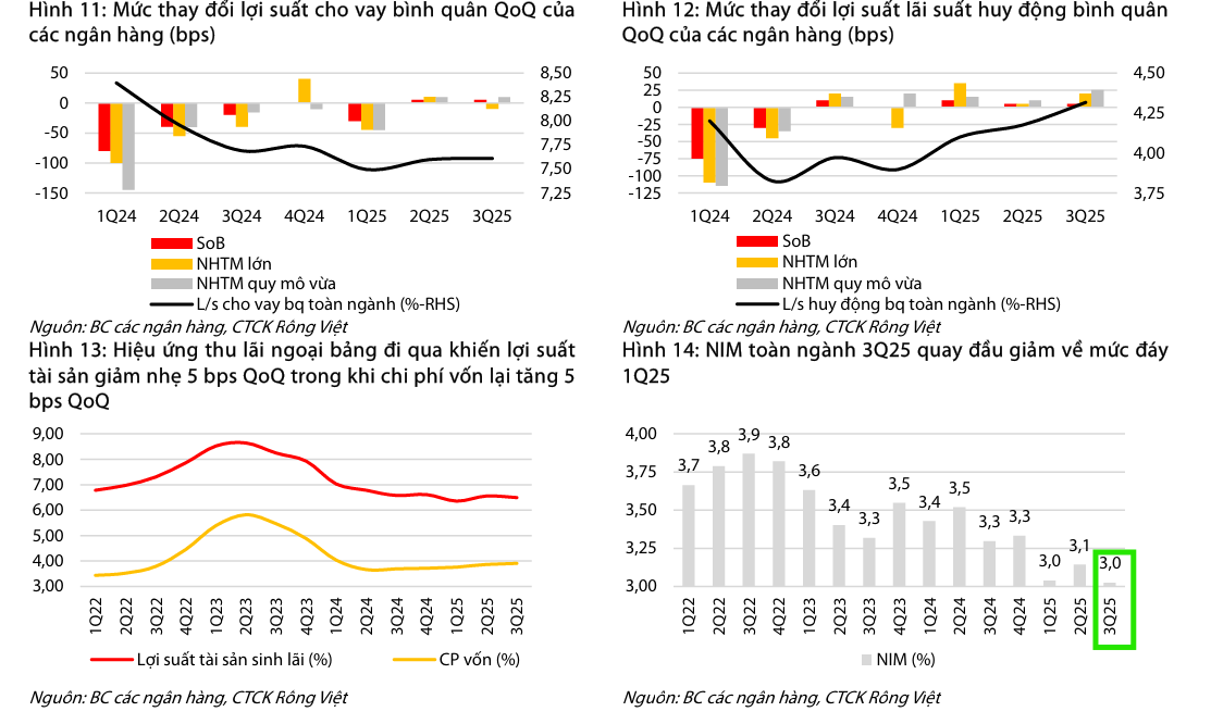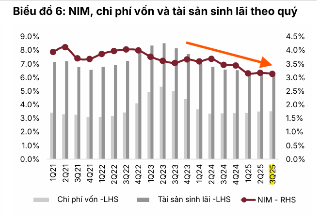 Biên lãi ròng (NIM) toàn ngành trong Quý 3 đã giảm 10 điểm cơ bản (bps) QoQ xuống mức 3.0%, tương đương với mức đáy hồi Quý 1/2025 và thấp hơn 30 bps so với cùng kỳ năm trước. Sự sụt giảm này chủ yếu do chi phí vốn (CoF) tăng 5 bps QoQ lên 3.9%, phản ánh xu hướng tăng lãi suất huy động.