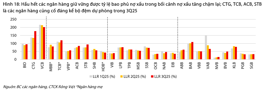 Quan trọng hơn, việc các ngân hàng tiếp tục tăng cường trích lập dự phòng cụ thể (34 nghìn tỷ đồng) đã giúp tỷ lệ bao phủ nợ xấu (LLR) toàn ngành cải thiện nhẹ lên 96% (so với 91% trong Quý 2/2025), củng cố bộ đệm rủi ro.