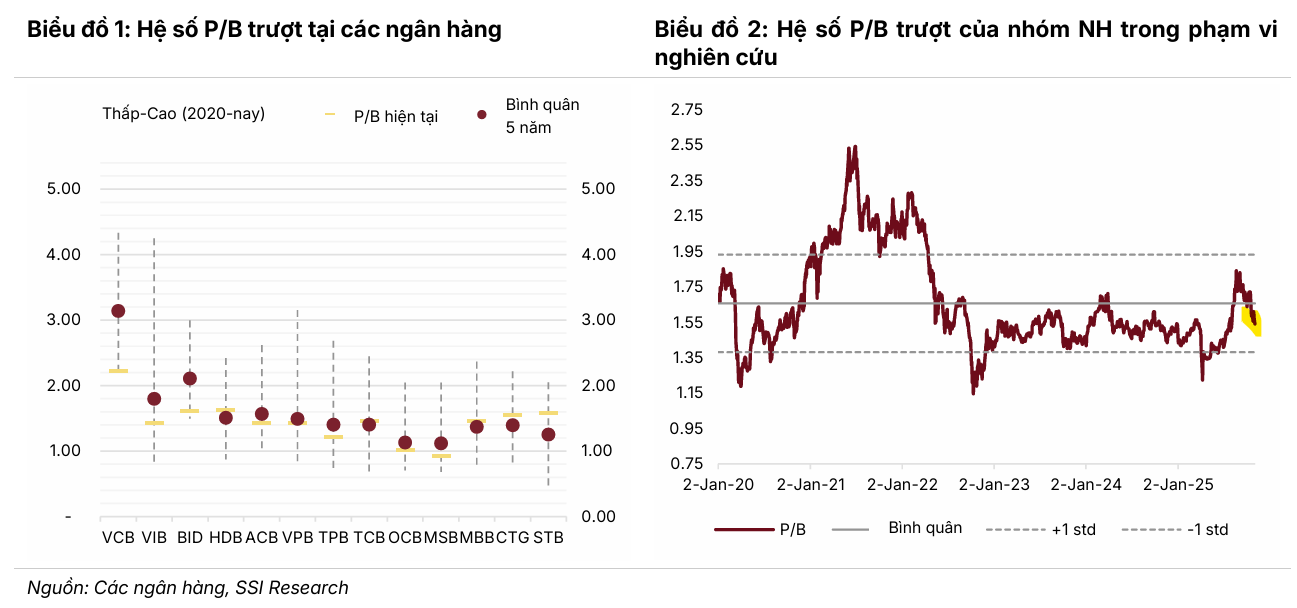 Sau khi đạt đỉnh 1.84 lần vào Tháng 8/2025, hệ số P/B trượt trung bình của các ngân hàng trong phạm vi nghiên cứu đã giảm 16.4% xuống còn 1.53 lần tính đến ngày 3/11/2025, thấp hơn mức trung bình 5 năm là 1.65 lần. Trong đợt điều chỉnh vừa qua, hệ số P/B trượt của STB, CTG, MBB và HDB vẫn cao hơn mức trung bình lịch sử, trong khi các ngân hàng còn lại ghi nhận mức giảm đáng kể. Ngoài ra, hệ số P/B dự phóng 2026 ước tính đạt 1.28 lần, phản ánh mức định giá hấp dẫn trong bối cảnh LNTT năm 2026 được dự báo tăng trưởng 18% yoy và tỷ suất sinh lời trên vốn chủ sở hữu (ROE) đạt 18%.