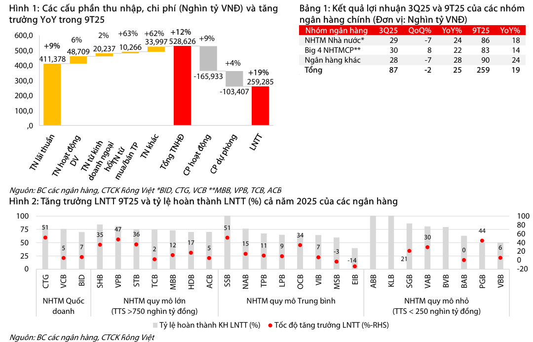 - Lợi nhuận toàn ngành ngân hàng niêm yết quý 3/2025 đạt 87 nghìn tỷ đồng (+25% YoY), nhờ tăng trưởng thu nhập ngoài lãi và thu nhập lãi thuần, trong khi chi phí hoạt động và dự phòng chỉ tăng nhẹ.