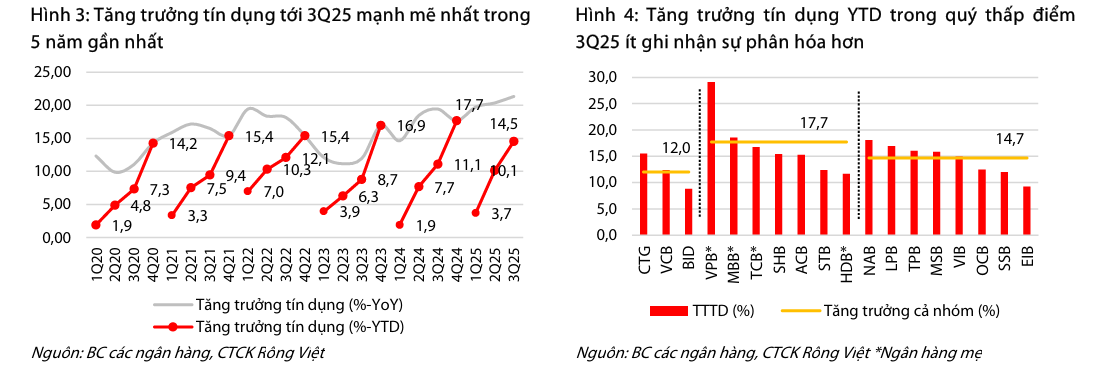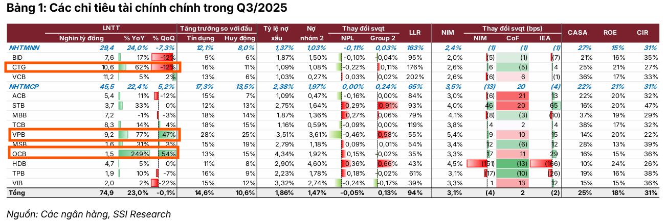 Trong khi đó, SSI Research cho rằng, Kết quả kinh doanh Quý 3 năm 2025 của các ngân hàng trong phạm vi nghiên cứu đã ghi nhận tổng lợi nhuận trước thuế (LNTT) đạt 74,900 tỷ đồng, tăng trưởng 23% so với cùng kỳ năm trước (yoy) và gần như đi ngang so với quý liền trước, nhìn chung phù hợp với dự báo đã đặt ra. Tuy nhiên, đà tăng trưởng mạnh mẽ so với cùng kỳ một phần được hỗ trợ bởi nền lợi nhuận thấp trong Quý 3/2024, và kết quả có sự phân hóa rõ rệt giữa các ngân hàng. Trong khi CTG, VPB và OCB ghi nhận kết quả vượt kỳ vọng, các ngân hàng như STB, VIB và BID lại có mức tăng trưởng thấp hơn dự báo.