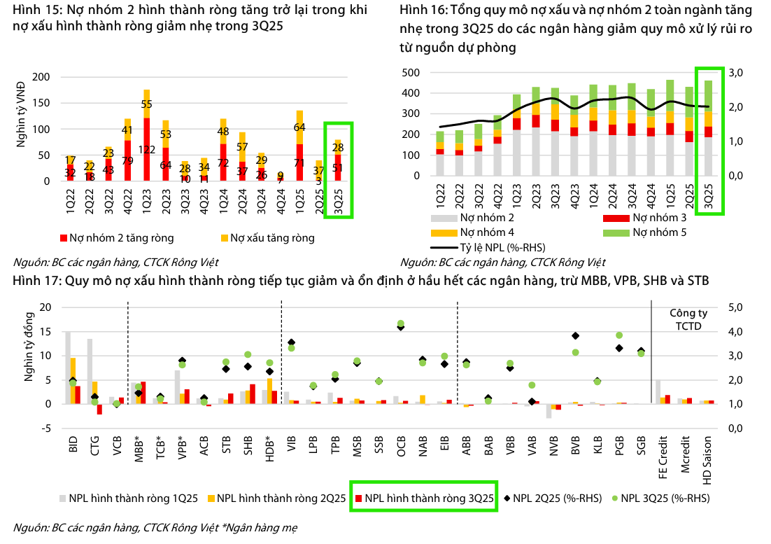 Theo dữ liệu của VDSC, mặc dù tổng nợ xấu nội bảng toàn ngành tăng nhẹ 7 nghìn tỷ đồng QoQ lên 274 nghìn tỷ đồng, khiến tỷ lệ nợ xấu ở mức 2.01% (giảm nhẹ so với 2.04% trong Quý 2/2025), VDSC cho rằng đây không phải là một yếu tố đáng lo ngại.