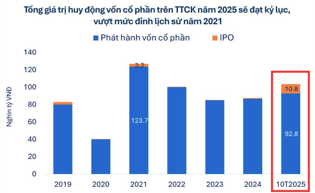 Theo số liệu từ FiinGroup, trong 10 tháng đầu năm 2025, tổng giá trị huy động vốn cổ phần trên thị trường chứng khoán (TTCK) đã đạt gần 104,000 tỷ đồng. Nếu tính thêm hai thương vụ IPO lớn của VPS và VPBankS đang diễn ra, con số này ước đạt khoảng 130,000 tỷ đồng.