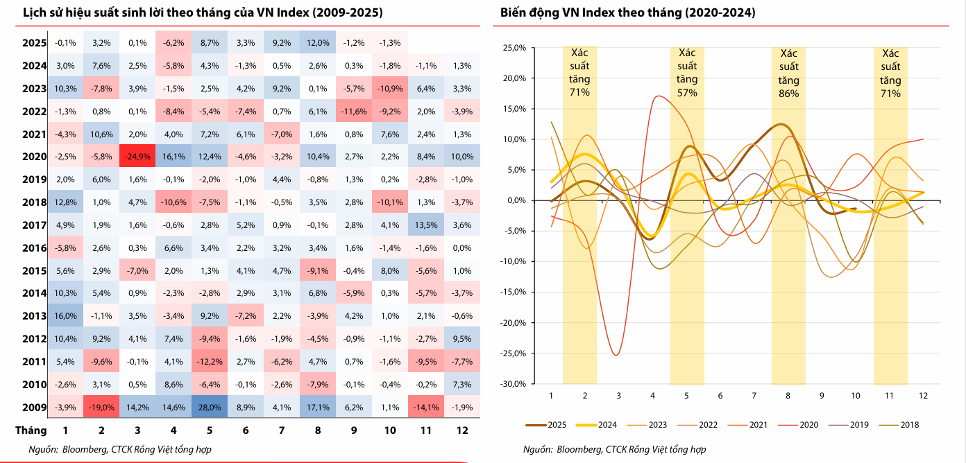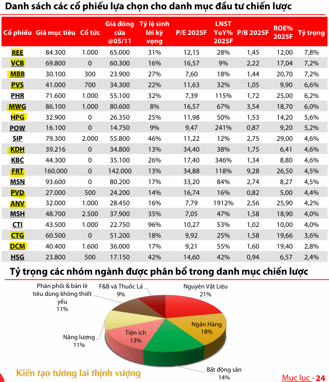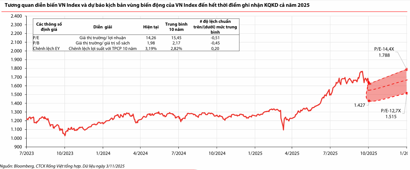 Triển vọng quý 4/2025 tích cực, với lợi nhuận doanh nghiệp dự báo tăng 26% YoY, P/E thị trường giảm về mức hấp dẫn 14.2 lần; VDSC khuyến nghị duy trì tỷ trọng cổ phiếu vừa phải, ưu tiên nhóm ngân hàng, bất động sản, tiêu dùng, xuất khẩu và năng lượng.