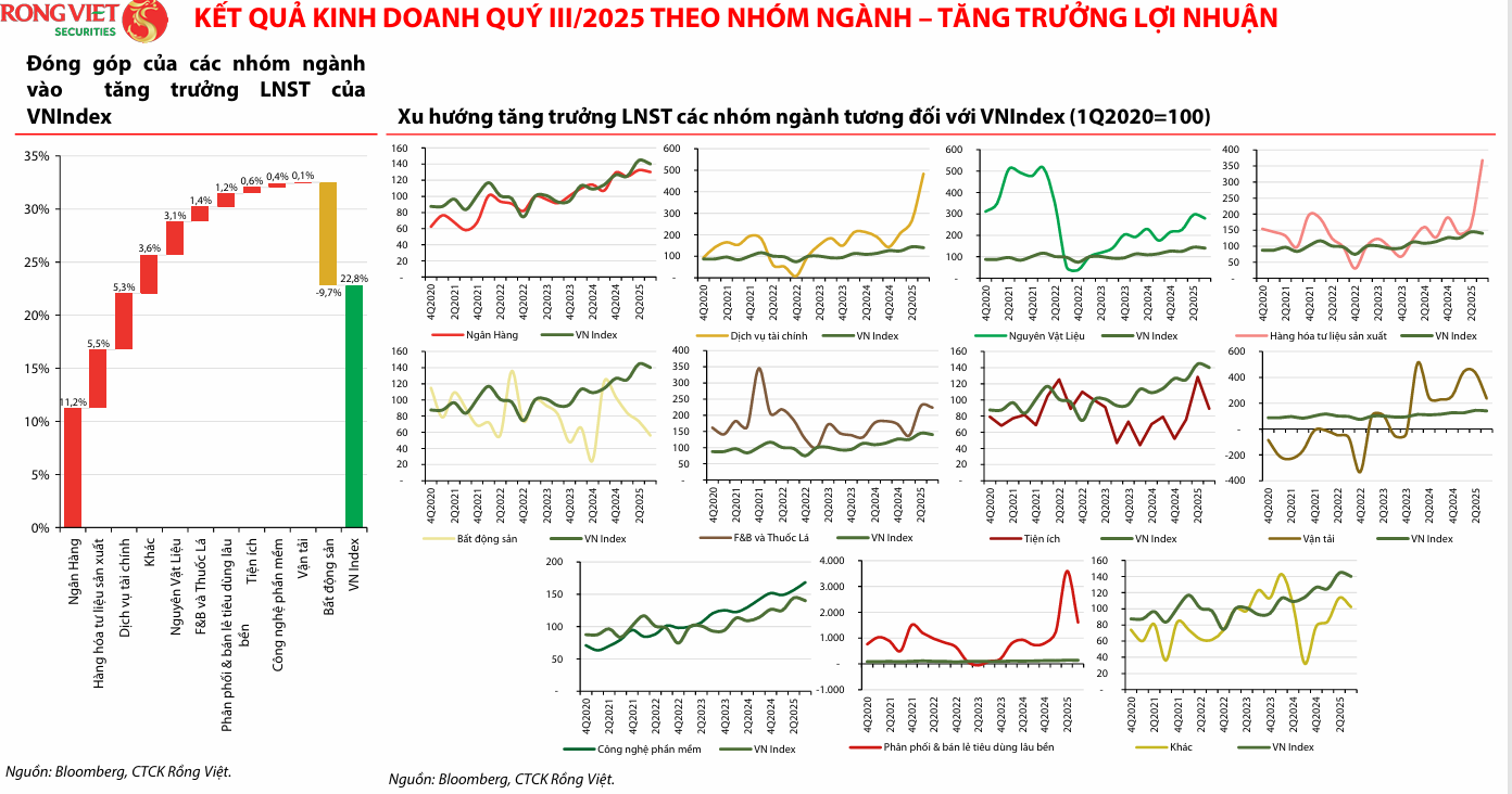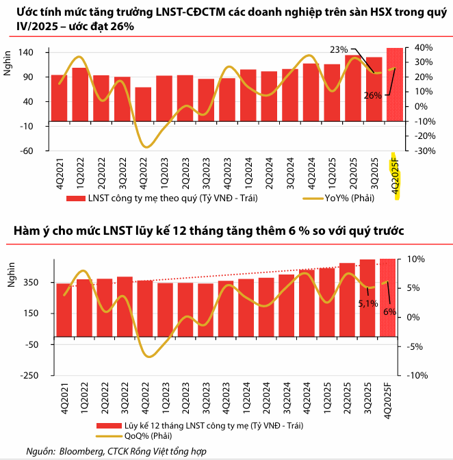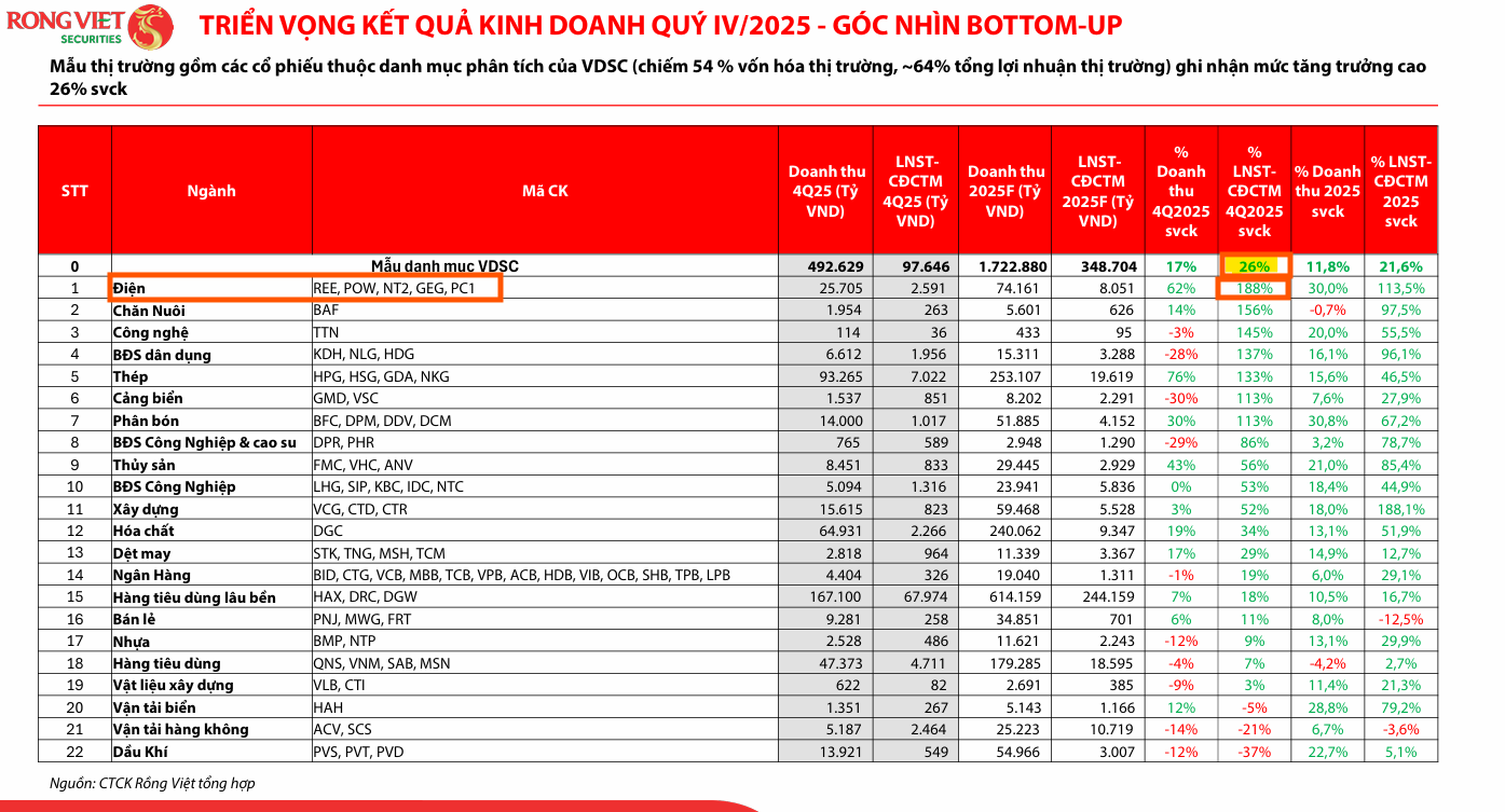Về triển vọng lợi nhuận, các động lực chủ chốt như kích cầu tiêu dùng nội địa, ổn định xuất khẩu, đẩy mạnh đầu tư công và tăng trưởng tín dụng tiếp tục là bệ đỡ. VDSC ước tính lợi nhuận toàn thị trường quý IV/2025 có thể tăng khoảng 26% so với cùng kỳ, với sự đóng góp chính từ các nhóm ngành bất động sản, ngân hàng, dịch vụ tài chính và nhóm phi tài chính.