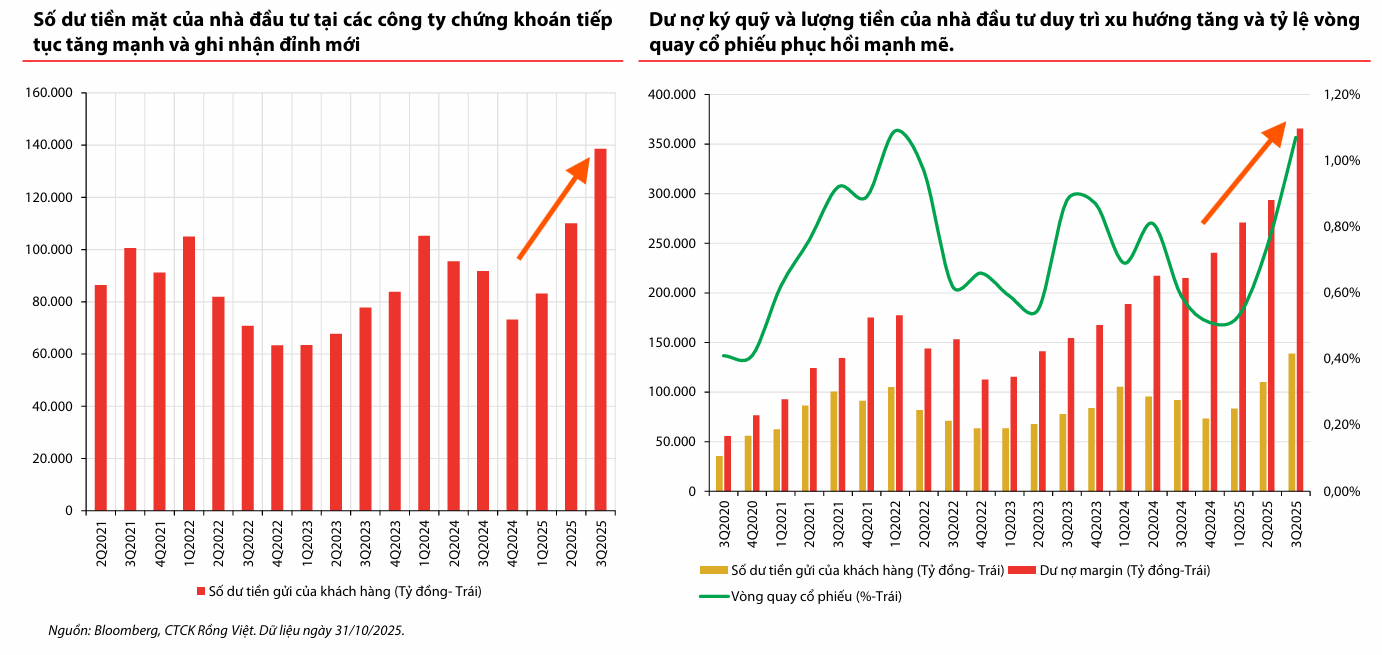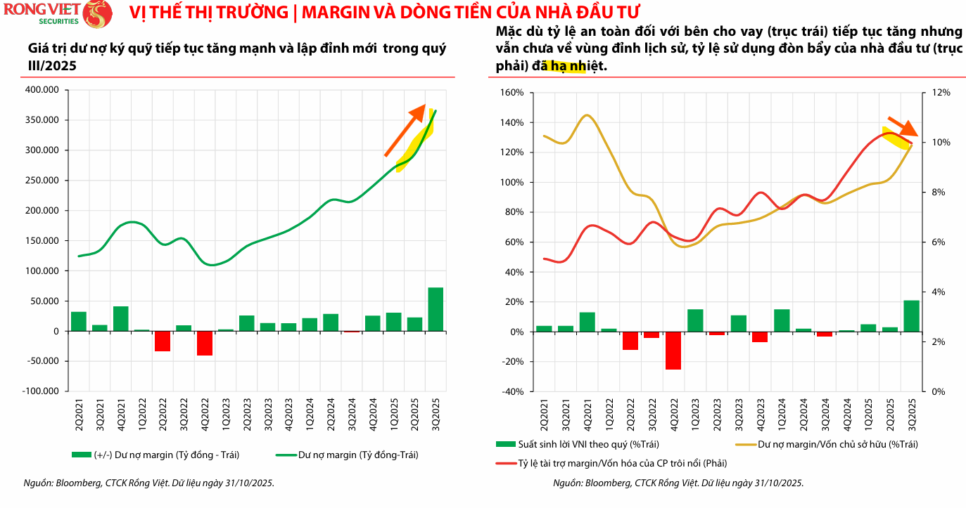 - Dòng tiền mới vẫn dồi dào dù margin cao, khi lượng tiền mặt tại công ty chứng khoán tăng, vòng quay danh mục nhanh, và tỷ lệ đòn bẩy thực tế đã hạ nhiệt, giúp giảm rủi ro margin call.