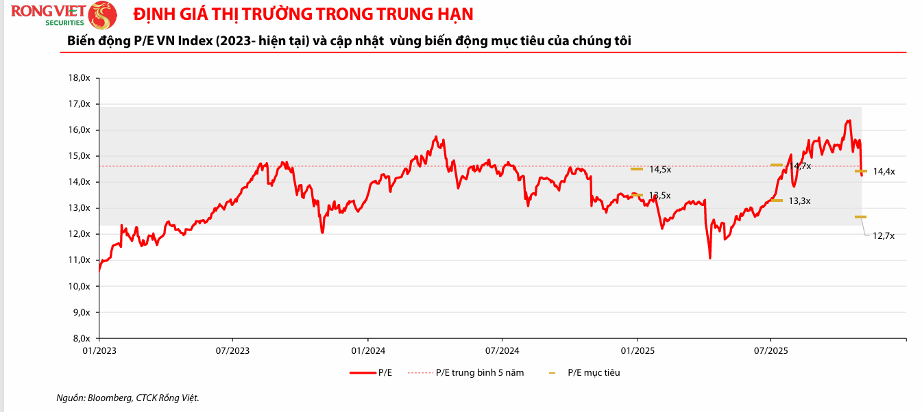 Sau khi phản ánh kết quả kinh doanh quý IV/2025, Trailing EPS toàn thị trường dự kiến tăng lên 120–124 đồng/cổ phiếu, giúp hệ số P/E thị trường giảm về mức hấp dẫn 14.2 lần. Dựa trên sự dịch chuyển của lãi suất phi rủi ro, VDSC đã điều chỉnh vùng định giá mục tiêu P/E của VN-Index xuống 12.7x–14.4x, tương ứng với vùng dao động hợp lý trong ba tháng tới là 1,427–1,788 điểm.