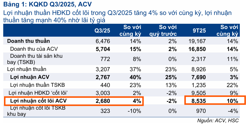 HSC cho biết, nếu loại trừ yếu tố không thường xuyên này, lợi nhuận từ hoạt động kinh doanh cốt lõi của ACV vẫn tăng trưởng ổn định 4% so với cùng kỳ. Lũy kế 9 tháng đầu năm 2025, lợi nhuận ròng của ACV đạt khoảng 7,700 tỷ đồng, hoàn thành 72% – 75% kế hoạch cả năm của các CTCK.