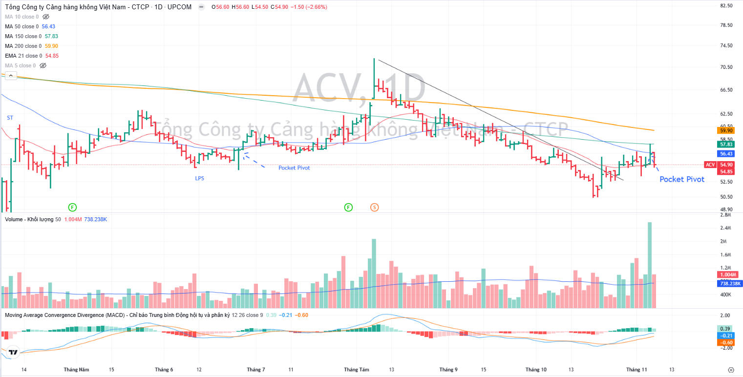 Trên đồ thị, RS của ACV là 31, hoạt động kém trên thị trường. Tuy nhiên, ACV có khả năng đã tạo đáy vào tháng 10, và đang cố gắng giành lại điểm mua vào ngày 6.11.2025. Elibook Team không có khuyến nghị giao dịch ở ACV nhưng kỳ vọng cổ phiếu này sẽ hồi phục trong thời gian tới.