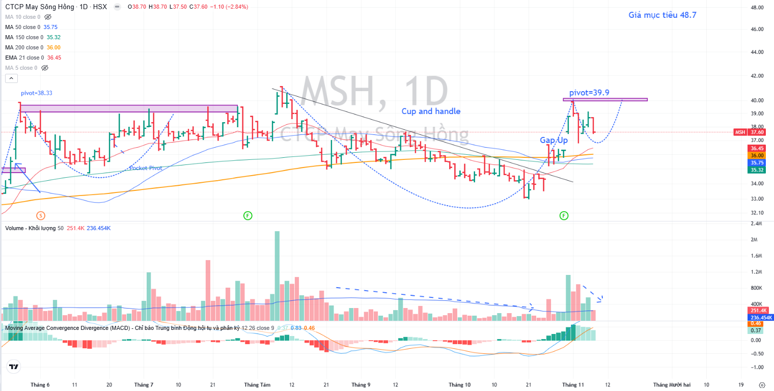 Sau báo cáo lợi nhuận quý 3 tích cực vượt kỳ vọng, MSH mở điểm mua Gap Up vào ngày 31.10.2025. Trước đó là điểm mua Gap Up khác sớm hơn vào ngày 27.10.2025. Elibook Team cho rằng, cổ phiếu này vẫn có thể mua được nếu xây lại tay cầm, với điểm mua pivot mới là 39,900 đồng.