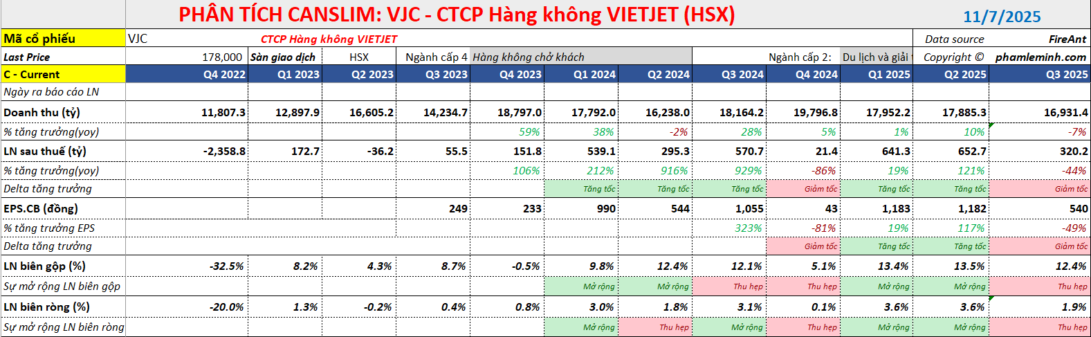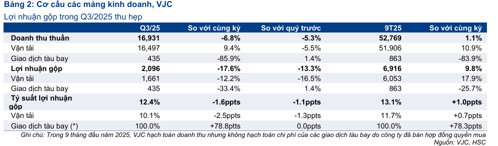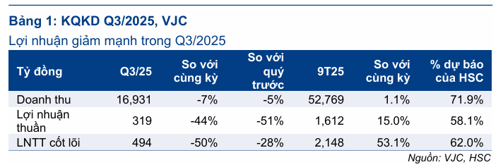Công ty Chứng khoán HSC nhận định kết quả kinh doanh quý 3 năm 2025 của VJC thấp hơn nhiều so với kỳ vọng, chủ yếu do áp lực từ chi phí hoạt động tăng cao và sự sụt giảm của mảng giao dịch tàu bay. Cụ thể, trong quý 3/2025, Lợi nhuận thuần của VJC giảm mạnh 44% so với cùng kỳ năm trước (giảm 51% so với quý trước) xuống mức 319 tỷ đồng, bất chấp doanh thu thuần đạt 16,900 tỷ đồng.