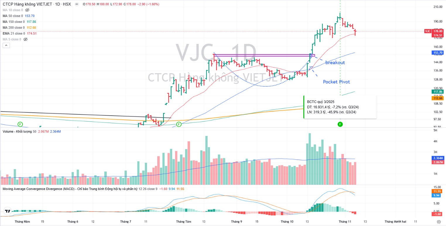 Trên đồ thị, VJC breakout Chiếc Cốc vào ngày 15.10.2025 và hiện đã tăng giá kéo dài. Cổ phiếu đang điều chỉnh về tìm hỗ trợ ở EMA 21 ngày. Elibook Team không có khuyến nghị giao dịch ở các cổ phiếu hàng không. Khả năng VJC tăng giá theo họ nhà chị Thảo, bao gồm cổ phiếu HDB.
