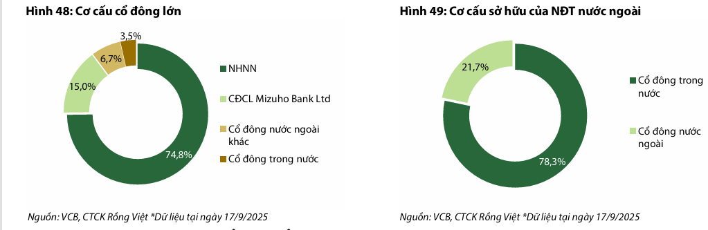 Tỷ lệ sở hữu nước ngoài tính đến ngày 17/9/2025 là 21.7%, như vậy tỷ lệ được phép sở hữu còn lại của các NĐT nước ngoài là 8.3%. Trong nhóm cổ đông nước ngoài, Mizuho Bank – cổ đông chiến lược duy nhất – duy trì tỷ lệ sở hữu 15% kể từ năm 2012 đến nay, thể hiện cam kết đồng hành lâu dài. Mizuho Bank cung cấp kinh nghiệm từ ngân hàng hàng đầu Nhật Bản trong quản lý rủi ro, số hóa, và mở rộng quốc tế cũng như triển khai các dự án chuyển đổi số. Cổ đông chiến lược này có một người đại diện vốn trong HĐQT của VCB.