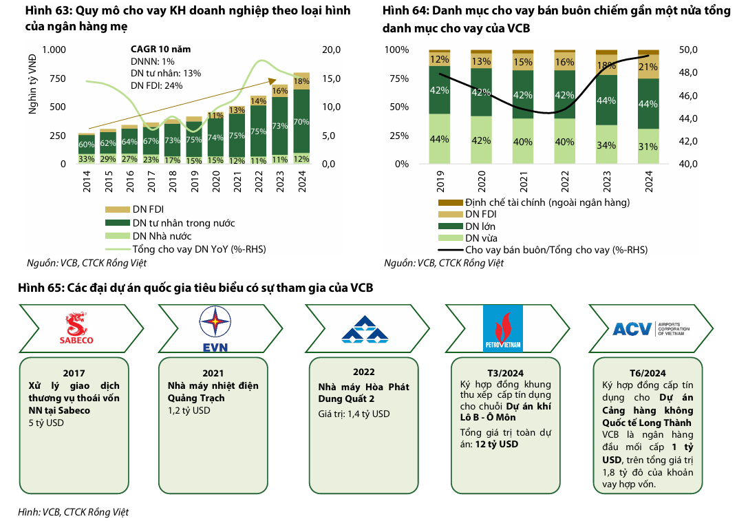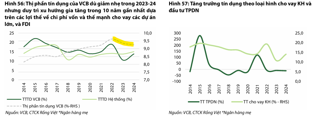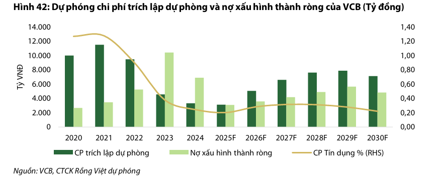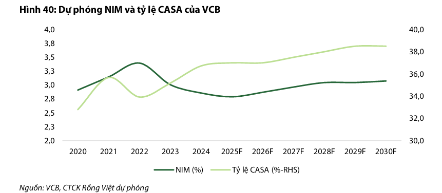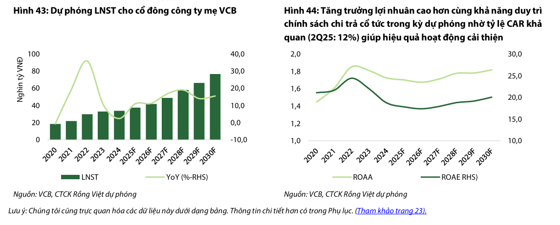 Mặc dù quan điểm điều hành thận trọng này có phần ảnh hưởng đến tốc độ tăng trưởng và hiệu quả hoạt động trong những năm kinh tế khó khăn gần đây, nó đã giúp VCB dự trữ nguồn lực để củng cố nền tảng vốn đã vững chắc. Ngân hàng hiện sẵn sàng cho sự tăng tốc trong những năm tới, khi nền kinh tế được dự báo có những bước chuyển mình tích cực hơn. VDSC dự báo lợi nhuận của VCB sẽ đạt tăng trưởng kép (CAGR) là 15% trong giai đoạn 2025F-2030F, trong đó tăng trưởng 11% cho năm 2025F.