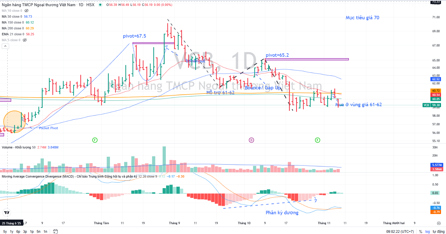 Trên đồ thị, VCB đang hình thành mẫu hình Hai Đáy (W). Hiện tại, Elibook Team đang khuyên snghij mua ở vùng giá 61-62,000 đồng. Sự phân kỳ âm giữa giá và MACD Histogram mang tới kỳ vọng tạo đáy/
