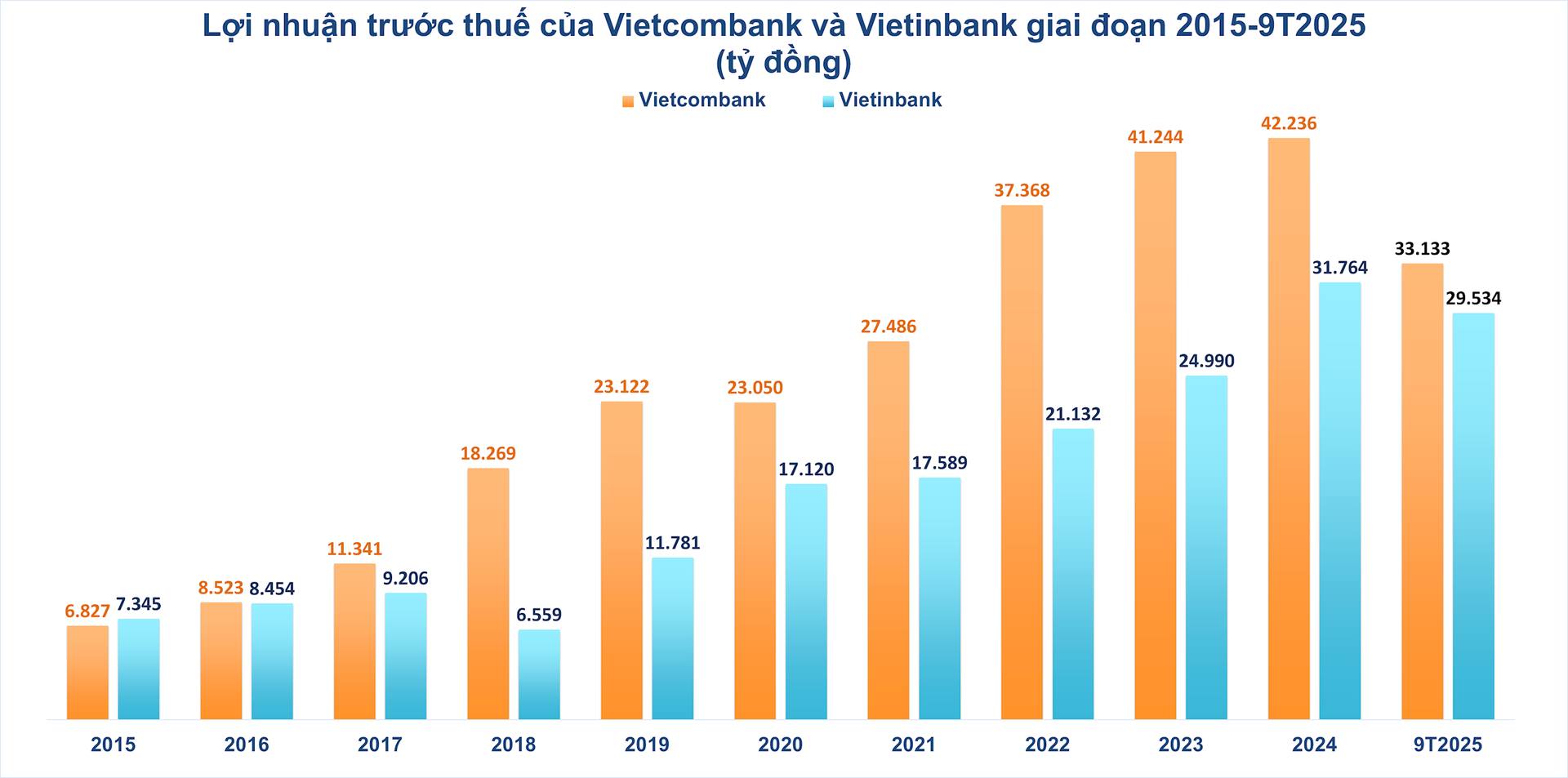 Năm 2024, VietinBank lần đầu vượt Vietcombank về thu nhập lãi thuần (62,403 tỷ đồng so với 55,406 tỷ đồng), và đến 9 tháng đầu 2025, khoảng cách lợi nhuận trước thuế giữa hai bên chỉ còn 3,600 tỷ đồng. Với biên lãi ròng cải thiện, chi phí vận hành tối ưu, tỷ lệ nợ xấu giảm và chiến lược mở rộng bán lẻ – SME hiệu quả, VietinBank đang tiến rất gần ngôi đầu lợi nhuận trong hệ thống ngân hàng Việt Nam.