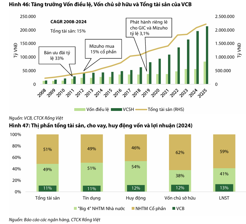 VCB duy trì vị thế dẫn đầu ngành, với lợi thế CASA lớn, chất lượng tài sản vượt trội, tỷ lệ nợ xấu dưới 1%, và dự báo tăng trưởng lợi nhuận kép 15% giai đoạn 2025F–2030F.