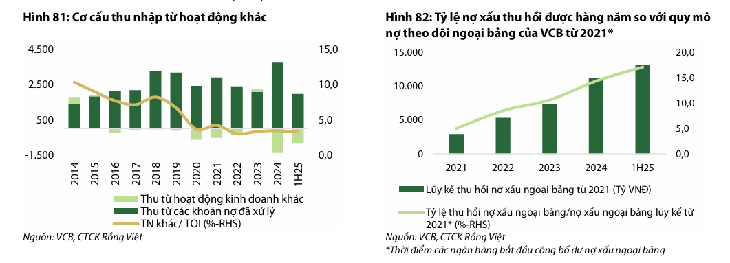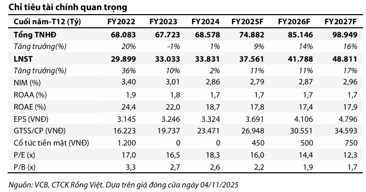 Riêng quý 3/2025, LNTT của VCB đạt 11,200 tỷ đồng (+1.9% QoQ, +5.0% YoY). Nhìn chung, kết quả lợi nhuận của ngân hàng được đánh giá là thấp hơn nhẹ so với kỳ vọng của Vietcap do Biên lãi ròng (NIM) không đạt như dự báo, từ đó Vietcap nhận thấy rủi ro điều chỉnh giảm nhẹ đối với dự báo lợi nhuận hiện tại.