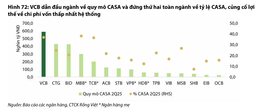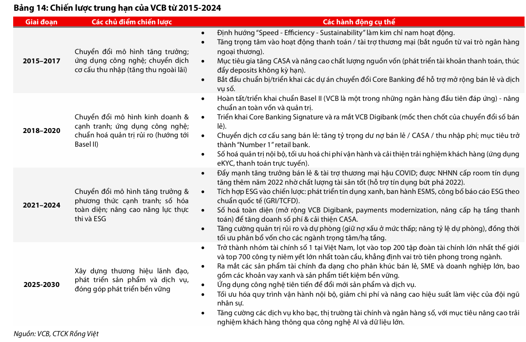 VCB là ngân hàng quốc doanh dẫn đầu toàn hệ thống về nhiều mặt: quy mô tiền gửi không kỳ hạn (CASA) mang lại lợi thế tuyệt đối về chi phí vốn thấp, chất lượng tài sản (từ năm 2014), và quy mô lợi nhuận (từ năm 2018). Những thành công này không chỉ dựa vào thương hiệu và uy tín, vốn là thế mạnh lịch sử giúp thu hút khách hàng doanh nghiệp lớn và dòng vốn FDI, mà còn đến từ phương thức điều hành chuẩn mực, đặt trọng tâm là quản trị rủi ro và phát triển bền vững.