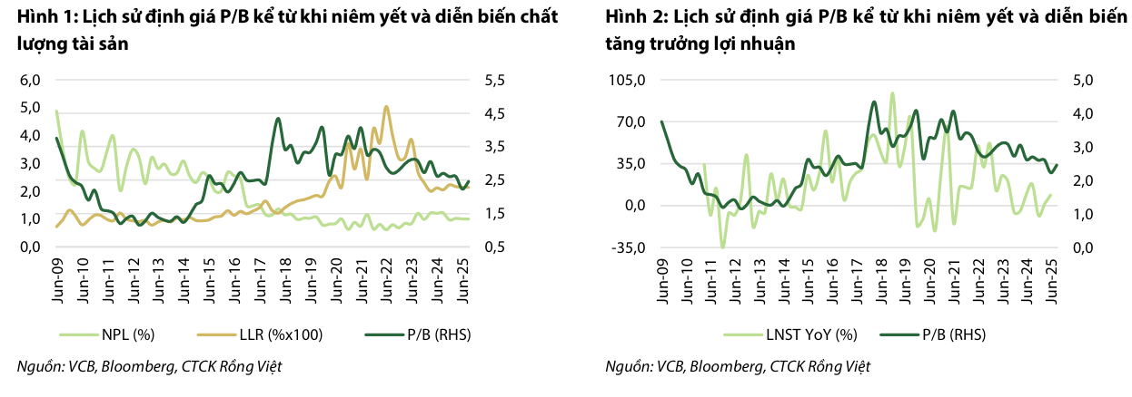 Diễn biến lịch sử định giá VCB: VCB từng đạt đỉnh P/B lịch sử 4.3 lần trong giai đoạn 2017-2018, phản ánh hiệu suất kinh doanh kỷ lục nhờ cải thiện khả năng sinh lời và kiểm soát nợ xấu thành công (NPL giảm xuống dưới 1% từ năm 2018). Ngược lại, giai đoạn 2022 đến nay chứng kiến P/B giảm từ 3.5 xuống 2.5, chủ yếu do áp lực nợ xấu toàn ngành, tăng trưởng lợi nhuận chậm lại, và ROAE suy giảm từ 24% (2022) xuống 17.5% (2Q25).