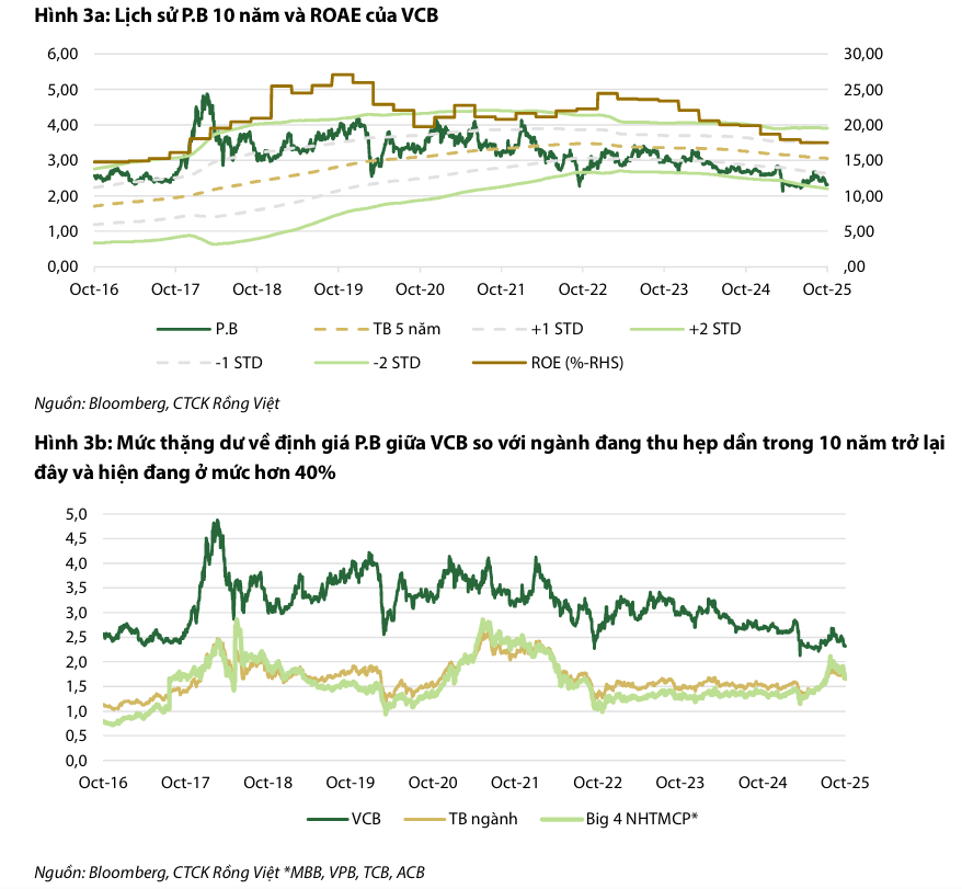 VDSC xác định giá mục tiêu 12 tháng tới là 69,800 VND, tương đương P/B dự phóng năm 2025F/26F lần lượt là 2.6 lần và 2.3 lần. VDSC (4.11.2025) tin rằng, VCB, với nền tảng quản trị rủi ro cẩn trọng và chất lượng tài sản vững chắc hàng đầu, đã sẵn sàng lấy lại đà tăng trưởng lợi nhuận hai chữ số ở mức cao trong trung hạn. Dựa trên phân tích thu nhập thặng dư và P/B, VDSC đưa ra khuyến nghị TÍCH LŨY đối với cổ phiếu VCB.