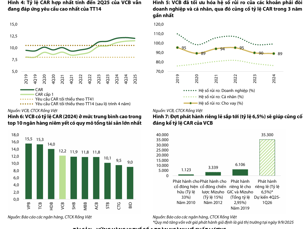 Nguồn vốn – Bộ đệm vốn vững chắc: VCB đi tiên phong trong việc áp dụng sớm Thông tư 41 (Basel II) từ năm 2019, thể hiện năng lực quản trị rủi ro mạnh mẽ. Tỷ lệ an toàn vốn (CAR) liên tục cải thiện và đạt 12.0% tính đến hết Q2/2025. Động lực cải thiện đến từ việc gián đoạn chi trả cổ tức tiền mặt, giảm hệ số rủi ro đối với các khoản phải đòi, và lợi nhuận tăng trưởng mạnh. Với kế hoạch phát hành riêng lẻ (6.5%) dự kiến cuối năm 2025 đến đầu năm 2026, VCB sẽ đáp ứng được các quy định mới về CAR theo Thông tư 14 (tiệm cận Basel III), cũng như có nhiều dư địa để cải thiện hơn nữa khi chuyển sang áp dụng phương pháp xếp hạng tín dụng nội bộ (IRB).
