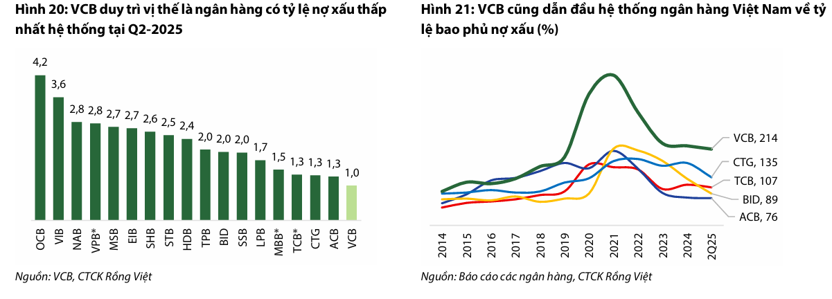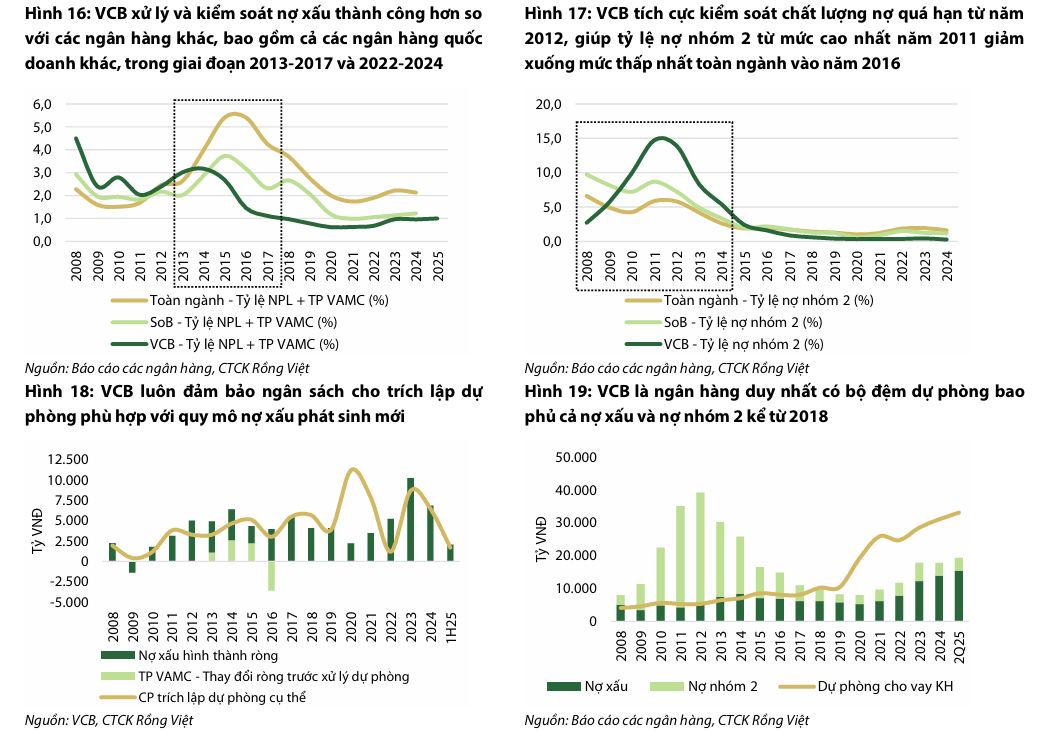 VCB nổi bật với khả năng kiểm soát chất lượng tín dụng. Tỷ lệ nợ xấu (gồm TP VAMC) luôn được kiểm soát ổn định dưới ngưỡng 1% từ năm 2018 đến nay, bất chấp các giai đoạn suy thoái kinh tế. VCB là NHTM đầu tiên hoàn thành việc mua lại nợ xấu VAMC từ năm 2015.