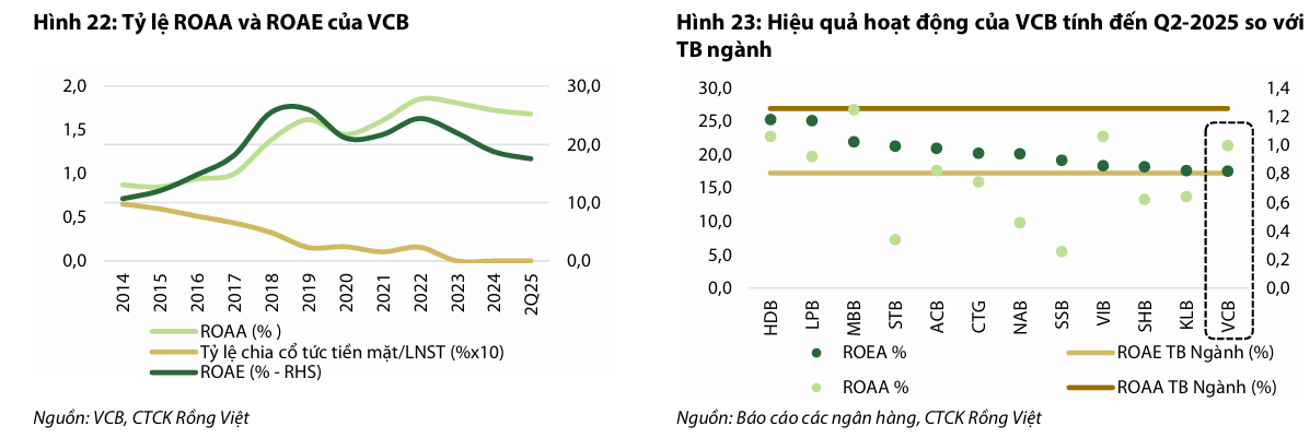Hiệu quả hoạt động (ROAA, ROAE) của VCB từng dẫn đầu ngành nhưng đã suy giảm nhẹ kể từ năm 2022 do lợi nhuận không duy trì được tăng trưởng như trước đó (do nhu cầu tín dụng yếu và NIM giảm).
