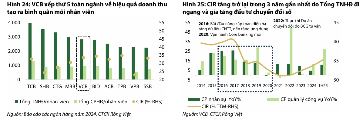 Tỷ lệ chi phí trên thu nhập (CIR) cũng tăng trở lại từ năm 2022, cho thấy thách thức trong việc cân bằng giữa đầu tư dài hạn (chuyển đổi số) và duy trì tăng trưởng thu nhập, mặc dù ngân hàng cần tối ưu hóa thu nhập để tránh CIR tiếp tục leo thang.