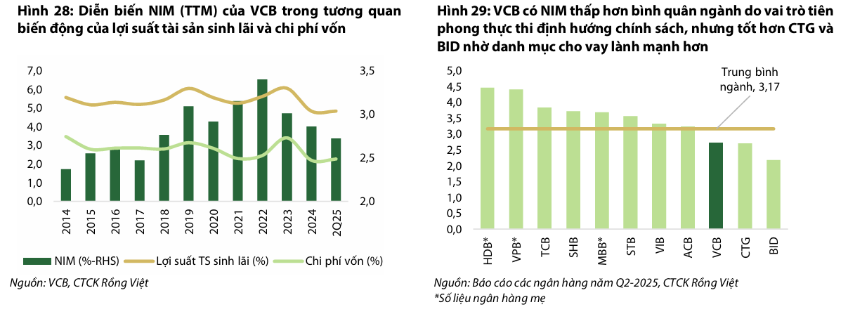 Khả năng sinh lời của VCB vẫn giữ ở mức cao nhất nhóm NHTM Nhà nước nhờ lợi thế tuyệt đối về chi phí vốn. NIM (TTM) đã hạ nhiệt về 2.7% tại Q2/2025 theo diễn biến chung toàn hệ thống, tuy nhiên, VCB vẫn duy trì mức lãi suất cho vay thấp nhất thị trường nhờ lợi thế cạnh tranh về chi phí vốn.