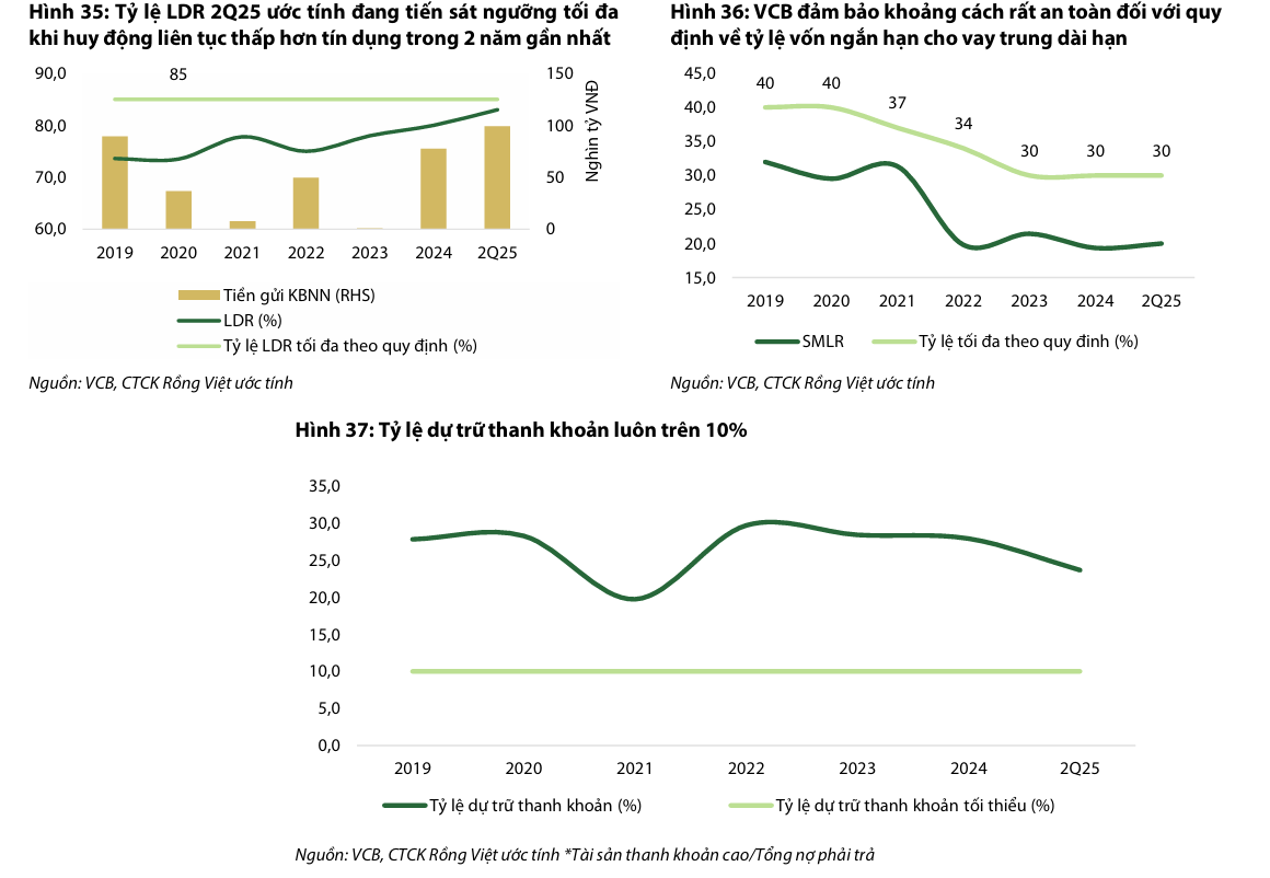 Tỷ lệ Cho vay trên Huy động (LDR) của VCB tăng nhanh chóng từ 73% (2019) lên 80% (2024), và lên 83% tại Q2/2025, gần sát ngưỡng quy định của NHNN. Điều này là do tăng trưởng huy động chậm hơn tăng trưởng tín dụng và quy định giảm dần tỷ lệ tiền gửi từ Kho bạc Nhà nước được tính vào LDR. Yếu tố này sẽ gây áp lực buộc VCB phải đẩy mạnh huy động trong ngắn hạn để đảm bảo tuân thủ tỷ lệ LDR.