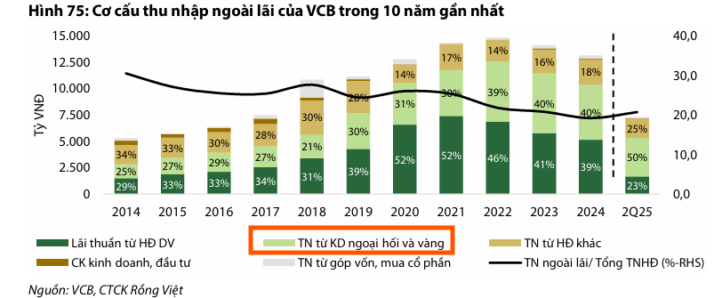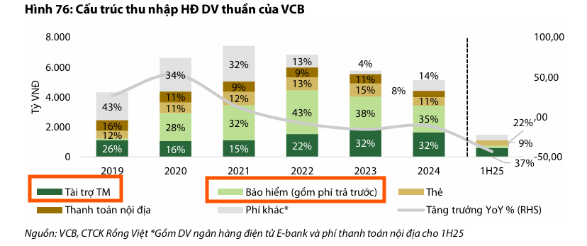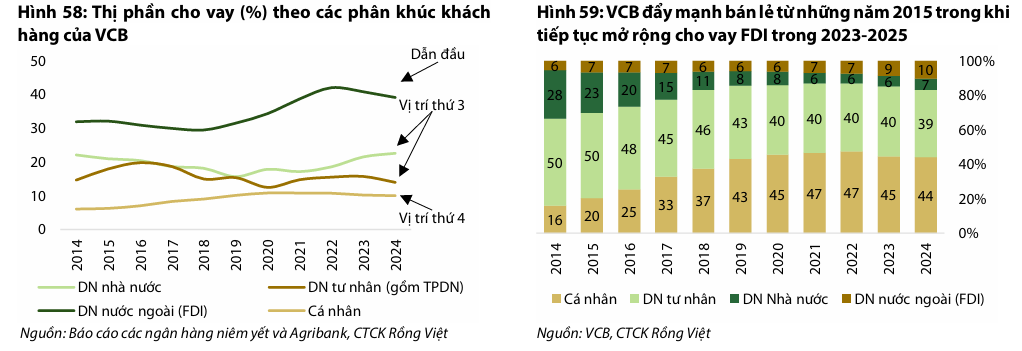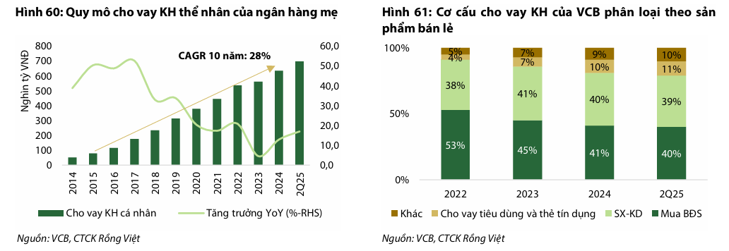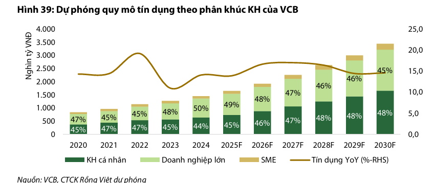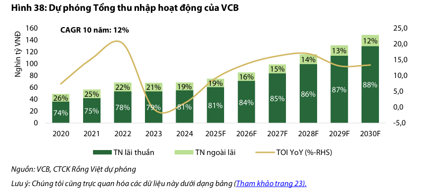 VDSC dự phóng Tổng thu nhập hoạt động giai đoạn 2025F-2030F sẽ đạt CAGR 15%, trong đó thu nhập lãi thuần dẫn dắt với CAGR 16%, dựa trên kỳ vọng tăng trưởng tín dụng bán lẻ 18% và bán buôn 14%. Rủi ro chính đối với dự phóng là diễn biến khó lường của chính sách thương mại Mỹ ảnh hưởng đến mảng tài trợ thương mại và khách hàng XNK của VCB.